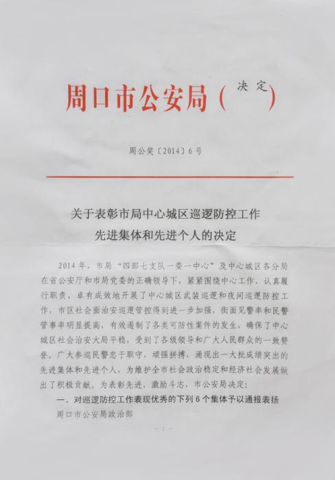 關(guān)于表彰市局中心城區(qū)巡邏防控工作先進(jìn)集體和先進(jìn)個(gè)人的決定