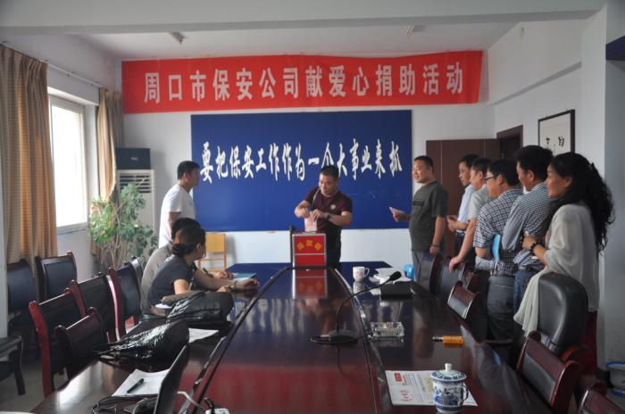 2014年6月9日上午,周口市保安服務(wù)公司管理人員在公司會議室舉辦了“向張宜兵同志先進事跡學(xué)習動員會”,并為他進行了捐款活動。會上,保安公司韓總經(jīng)理倡儀公司大力開展保安大討論活動,旨在通過討論活動,讓廣大保安員認識到自身職責作用,提高社會各界對保安人員的認識度。