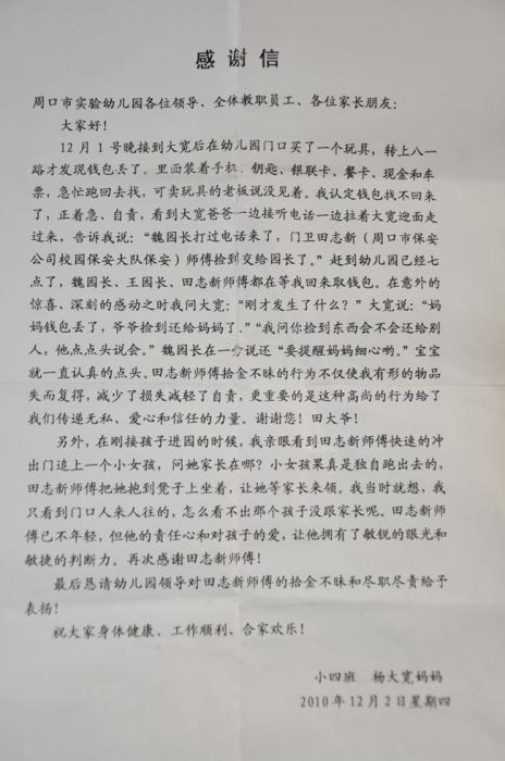 原來事情的詳細經(jīng)過是這樣的:12月1日晚,校園保安大隊保安員田志新在周口市實驗幼兒園值班時,在大門口撿到一個紅色皮錢包,立即交給了后勤園長,錢包內(nèi)裝有一部新手機、現(xiàn)金、銀行卡、飯卡、U盤、車票等物品。當(dāng)天晚上失主認領(lǐng)了錢包和物品,失主為了表示感激之情,又特意制作一面錦旗向保安公司校園保安大隊保安員表達感謝。