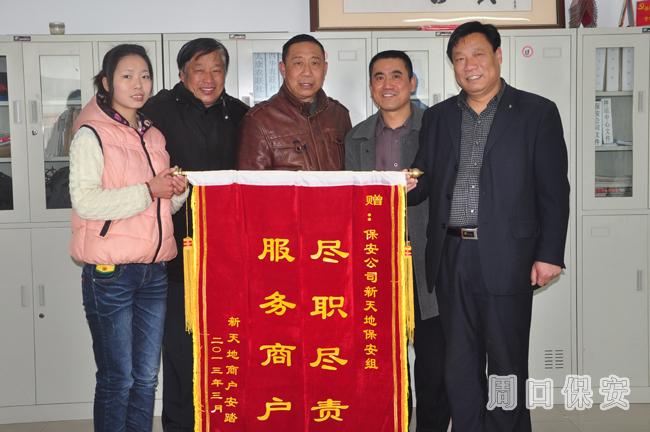2013年3月13日下午15時(shí)左右,周口市保安公司人防一大隊(duì)新天地崗點(diǎn)保安員周元敬等四人正地進(jìn)行安保巡邏,當(dāng)他們巡邏至新天地安踏虎痁門前時(shí),發(fā)現(xiàn)一名男子正在撬一輛三輪電動(dòng)車的車鎖,保安員及時(shí)上前,那名盜車男子見狀倉(cāng)惶逃走,被撬三輛電動(dòng)車鎖已被破壞,而那輛三輪電動(dòng)車卻幸免沒有盜走。正是新天地幾名保安員的認(rèn)真負(fù)責(zé)和堅(jiān)持履職的負(fù)責(zé)精神,不僅保護(hù)了客戶的財(cái)產(chǎn)安全,而且贏得了客戶們的一致好評(píng)。3月14日,新天地安踏虎店老板送來(lái)繡有“服務(wù)商戶 盡職盡責(zé)”的錦旗一面,并表達(dá)了對(duì)保安員的一片感激之情。